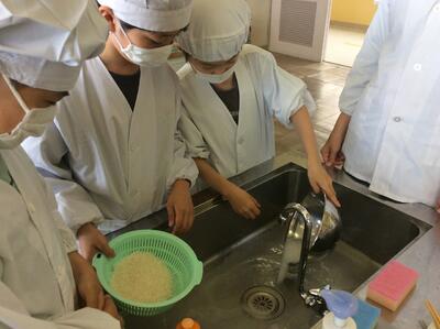 家庭科の学習で、ご飯を炊き、みそ汁を作りました。ご飯が炊けるまでの鍋の中の様子をじっくり観察したり、音を聞いたりして、自然の家での野外炊飯に向けてコツをつかんだようです。みそ汁づくりでは、だしをとるところから調理しました。班ごとに、昆布だし、鰹節だし、昆布と鰹節の合わせだしにすると計画を立てておいしいみそ汁を作りました。分担して調理や片付けまで行い、みんなの協力がさらに強まった活動になりました。