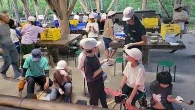 自然の冒険、ドラム缶風呂の後は野外炊飯。班の仲間と協力して、カレーライスを作りました。どの班も協力し合って、作ることができました。ご飯もカレーも上手にできました。最高の笑顔で「いただきまーす。」