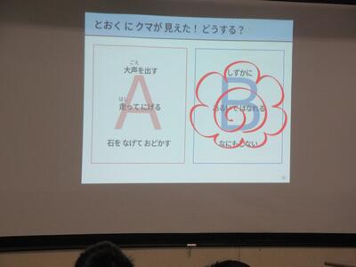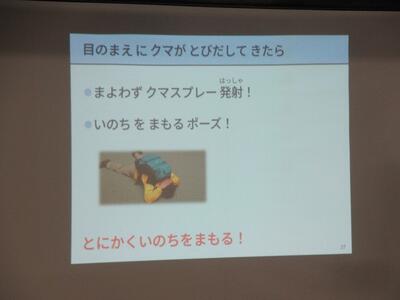今日は、東北野生動物保護管理センターより講師の方をお招きし、クマ対応教室を行いました。クマの生態や、クマに出会わないようにするための方法、出会ってしまったときの対処法など、たくさんのお話をお聞きしました。他人ごとではないクマの問題、子どもたちは一人一人真剣に考える姿が見られました。「ひとがクマをさける!」を意識した生活が大切だと分かりました。