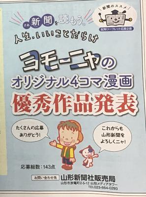 授業やNIEタイムで、新聞を読む活動や新聞記事を紹介する活動を継続して続けています。その活動の一つとして、山形新聞の企画の「ヨモーニャのオリジナル4コマ漫画」の作品作りに取り組みました。絵の中の吹き出しに、自分で考えた文章を書きこみ、4コマ漫画を作り、5,6年生が応募しました。