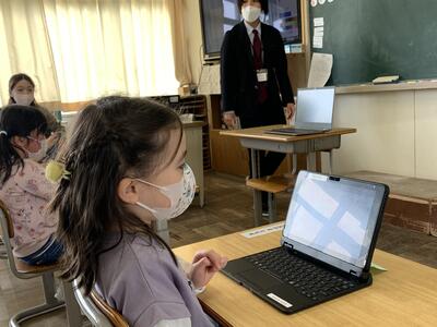 ICT支援員の先生と一緒に、タブレットの学習です。