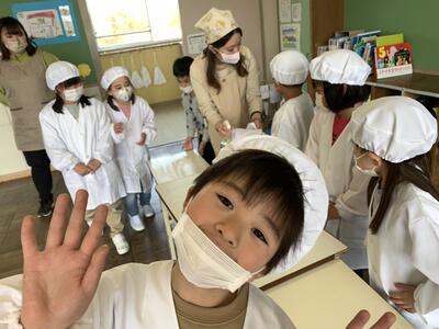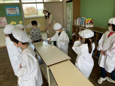 いよいよ給食です。真新しい真っ白な給食着に着替え、しっかり手を洗って準備開始!