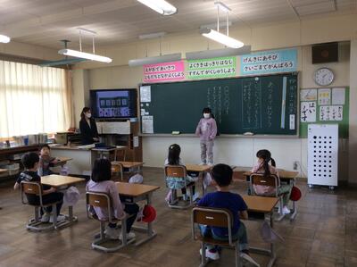 1年生の給食が始まりました。初日の17日は、給食の学習です。給食着の着方や準備の方法、分担などしっかり話を聞いていました。