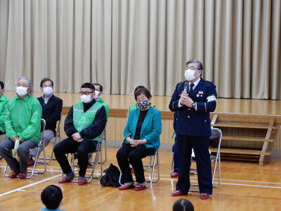 たくさんの地域の方々にご協力をいただきます。安全に登下校ができるよう、また、地域での遊びの様子や自転車の乗り方などを見守ってくださる方々です。交通指導員さんからは、「あいさつで元気を地域に広げてください。そして、安全に登下校してください。」と子どもたちにお話しいただきました。
