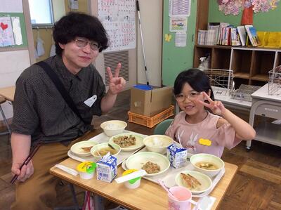 1年生で親子の給食試食会が行われました。準備からおうちの方と一緒に行いました。いつもおいしくいただいている給食ですが、おうちの方と食べる給食はさらに格別です。その後、給食センターの栄養教諭の先生から、栄養指導をしていただきました。これからもしっかりおいしい給食を食べて、「うれしい」「うるわしい」生活をしていきます。